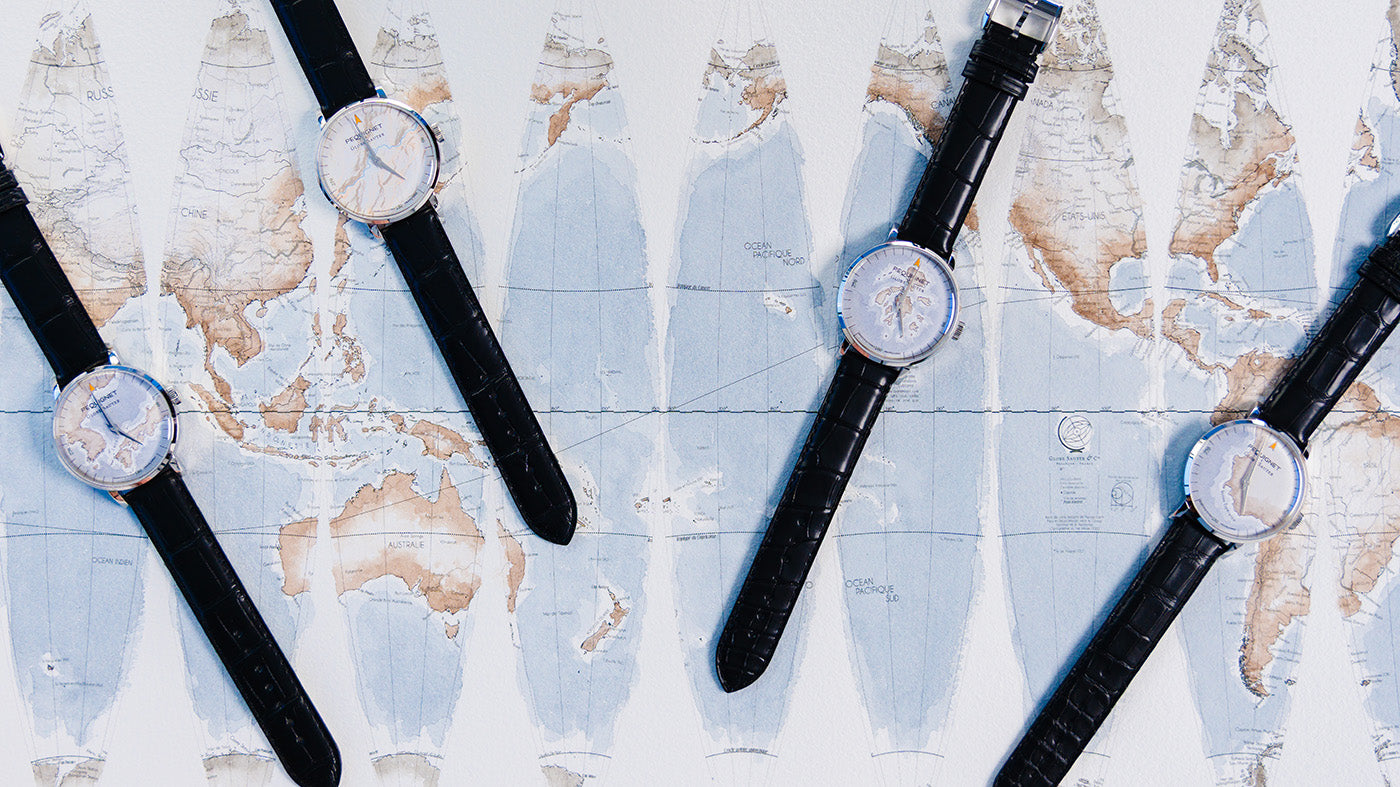 Chaque cadran est une carte d'un bout du monde, dont les traits sont imprimés en noir carbone sur papier 100% coton de la papeterie Zube-rieder (Boussières, à 10 km de Besançon), puis peinte à l'aquarelle à la main.