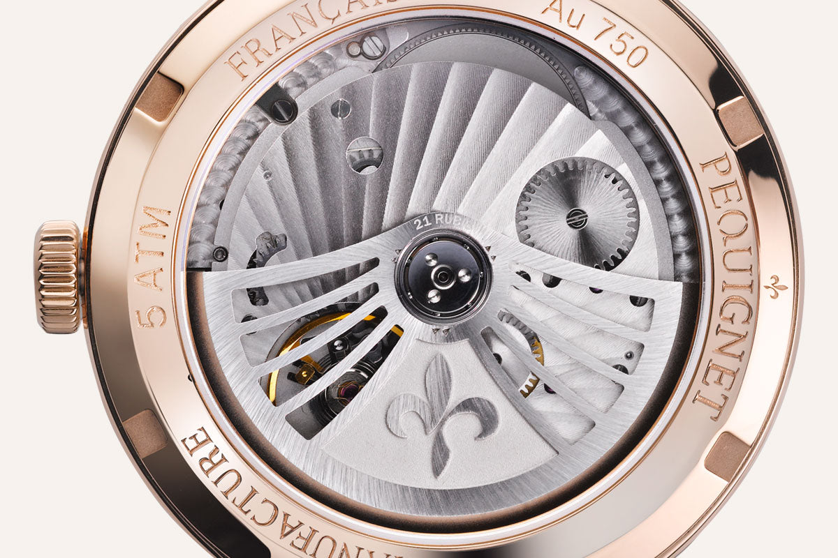 Conçu pour animer la collection Attitude de la Maison Pequignet, le Calibre Initial® dispose de deux brevets internationaux, dont l’un pour son système de saut de date semi-instantanée. Ce nouveau mouvement est entièrement constitué de composants produits dans un rayon de 80km autour de Morteau.