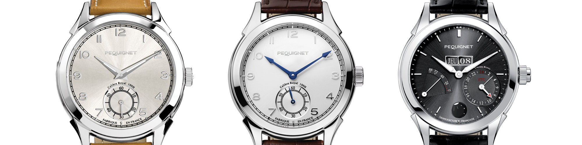 Elégantes et raffinées, les montres de la collection Royale sont équipées de deux mouvements français conçus et développés par la Manufacture Pequignet en France, le Calibre Royal®