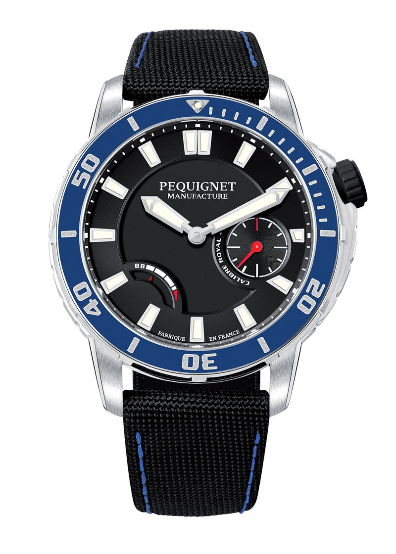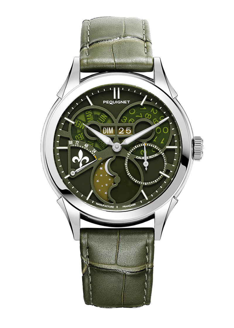 Au cœur de ce modèle bat le Calibre Royal®, le premier mouvement de haute horlogerie conçu et assemblé par Pequignet à Morteau qui offre une réserve de marche de 96h.