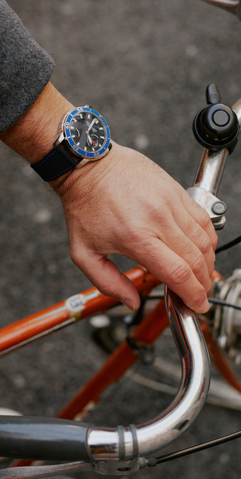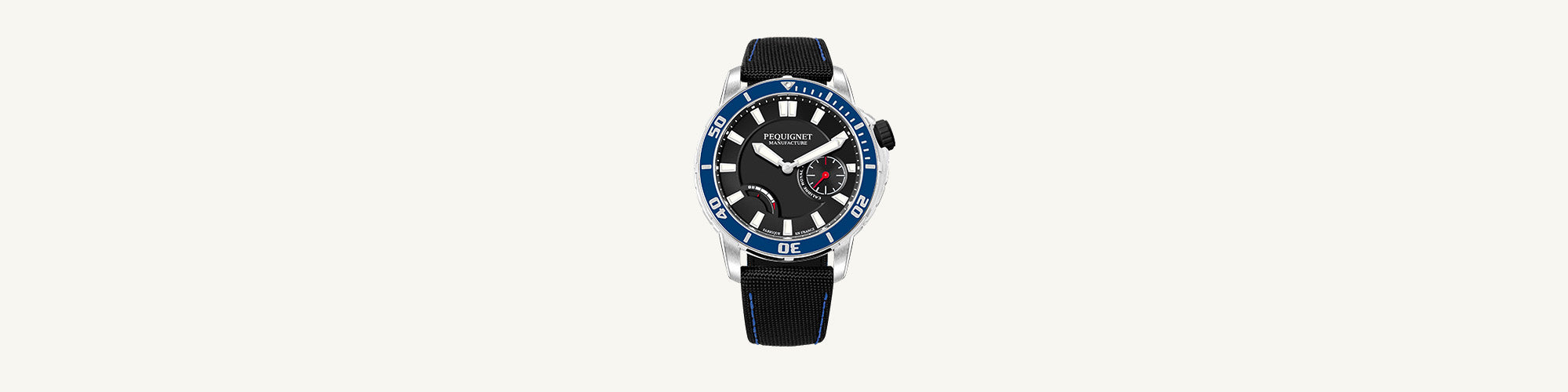Adorned with black, blue or orange rubber strap featuring the Pequignet logo or a saddle-stitched highly resistant technical cordura strap, Extrême 300 watches are closed on athletes’ wrists by a steel folding buckle. A 43 mm round screwed steel case completes the functional design of this model intended to accompany the adventures of everyday life.
