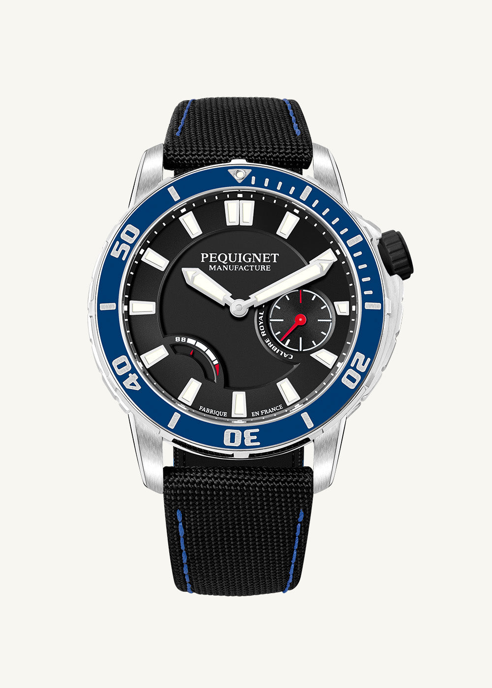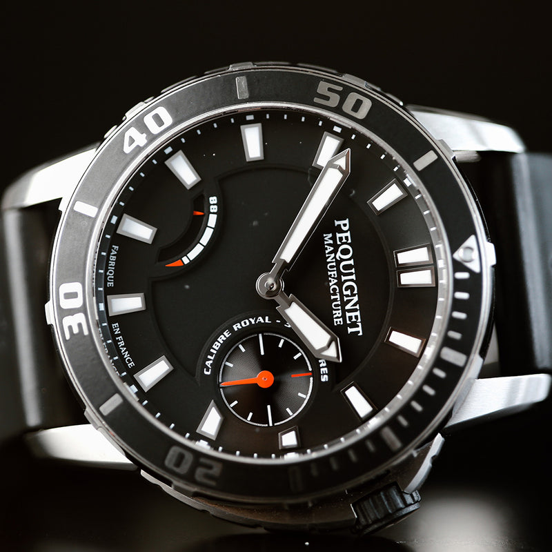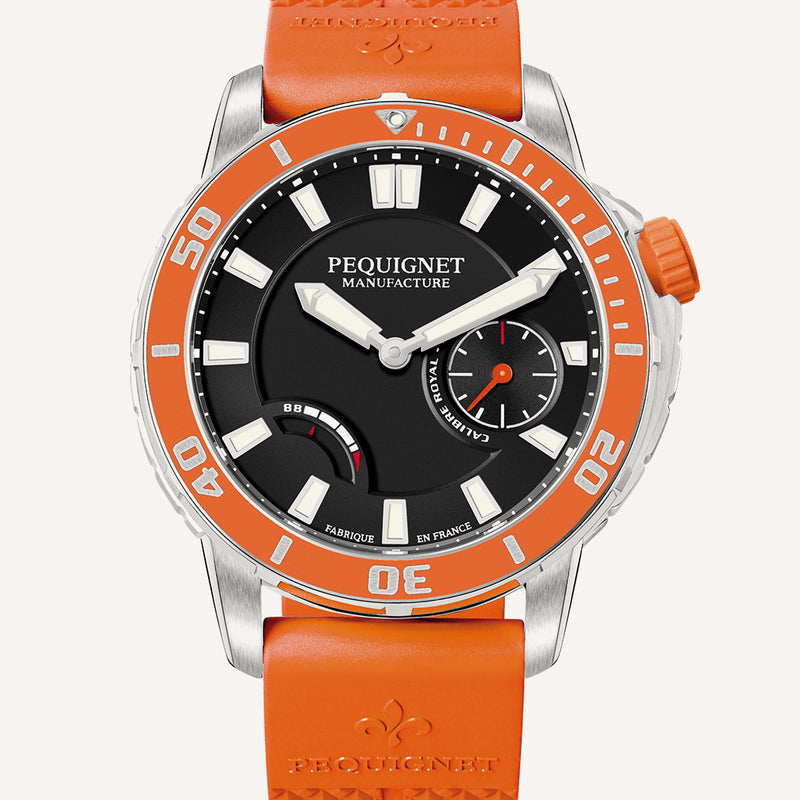Fitted with the Calibre Royal, a Manufacture Pequignet movement, the Extrême 300 is a tried and tested robust watch. All the qualities of this exceptional calibre are put to good use on this sporty model whose oscillating weight and large balance wheel with compensating screws are remarkably precise. With its 88-hour power reserve indicated at 8 o’clock, and its water resistance at 30ATM, the Extrême 300 will accompany the most intrepid divers to the sea bottom. Featuring a patented unidirectional rotating bezel overmoulded with Vulcamix ® vulcanized rubber, it adapts to all uses. Its patented quarter-turn crown allows simplified screwing and a Billight® LumiNova® capsule placed at 12 o'clock offers perfect readability at all times. Those who wear an Extrême 300 are guaranteed perfect accuracy thanks to the small second at 3 o'clock.