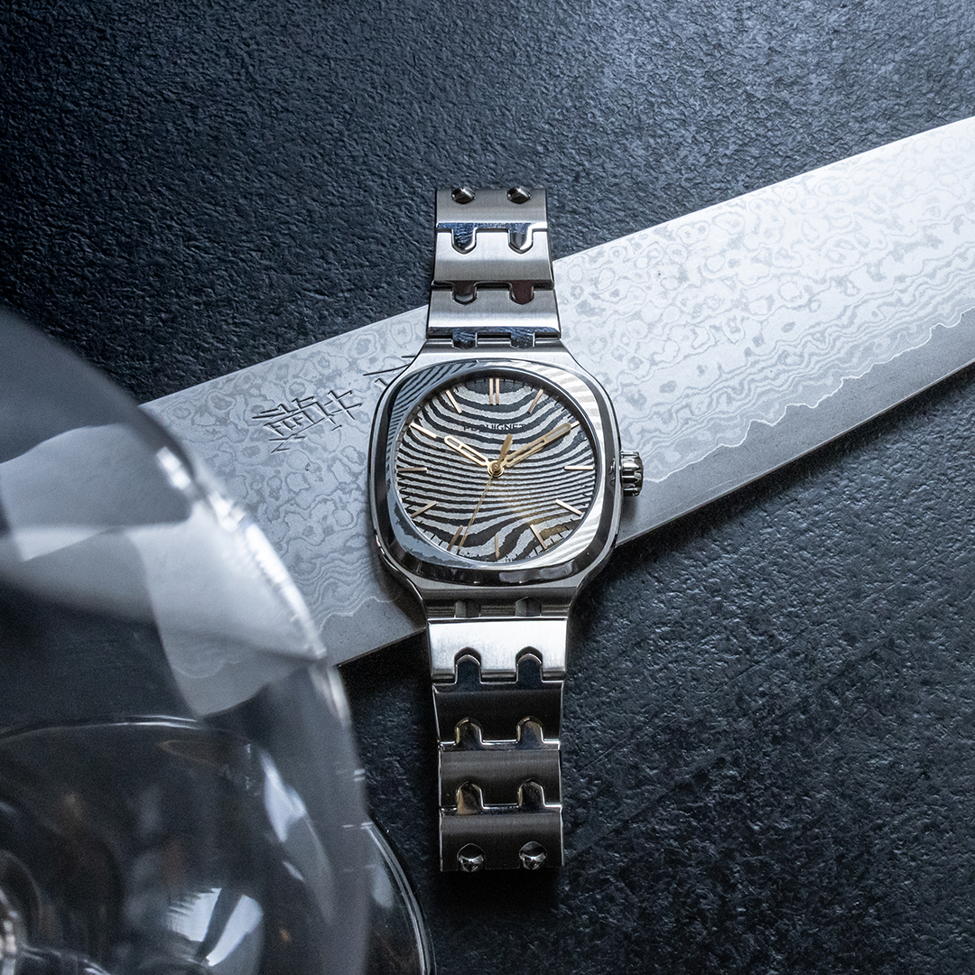 Limited to just 50 pieces, this edition also features an exclusive touch: a handwritten phrase by the chef visible on the case back. The Concorde Damas is presented in a box inspired by knife cases, which also includes an additional strap and a matching Damascus steel knife.