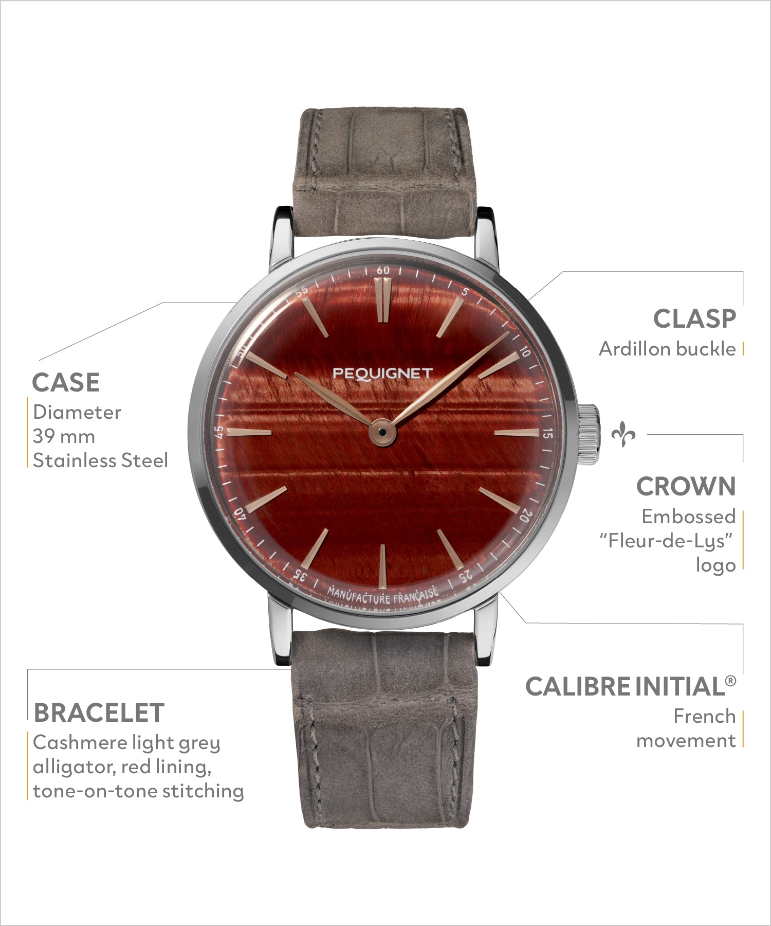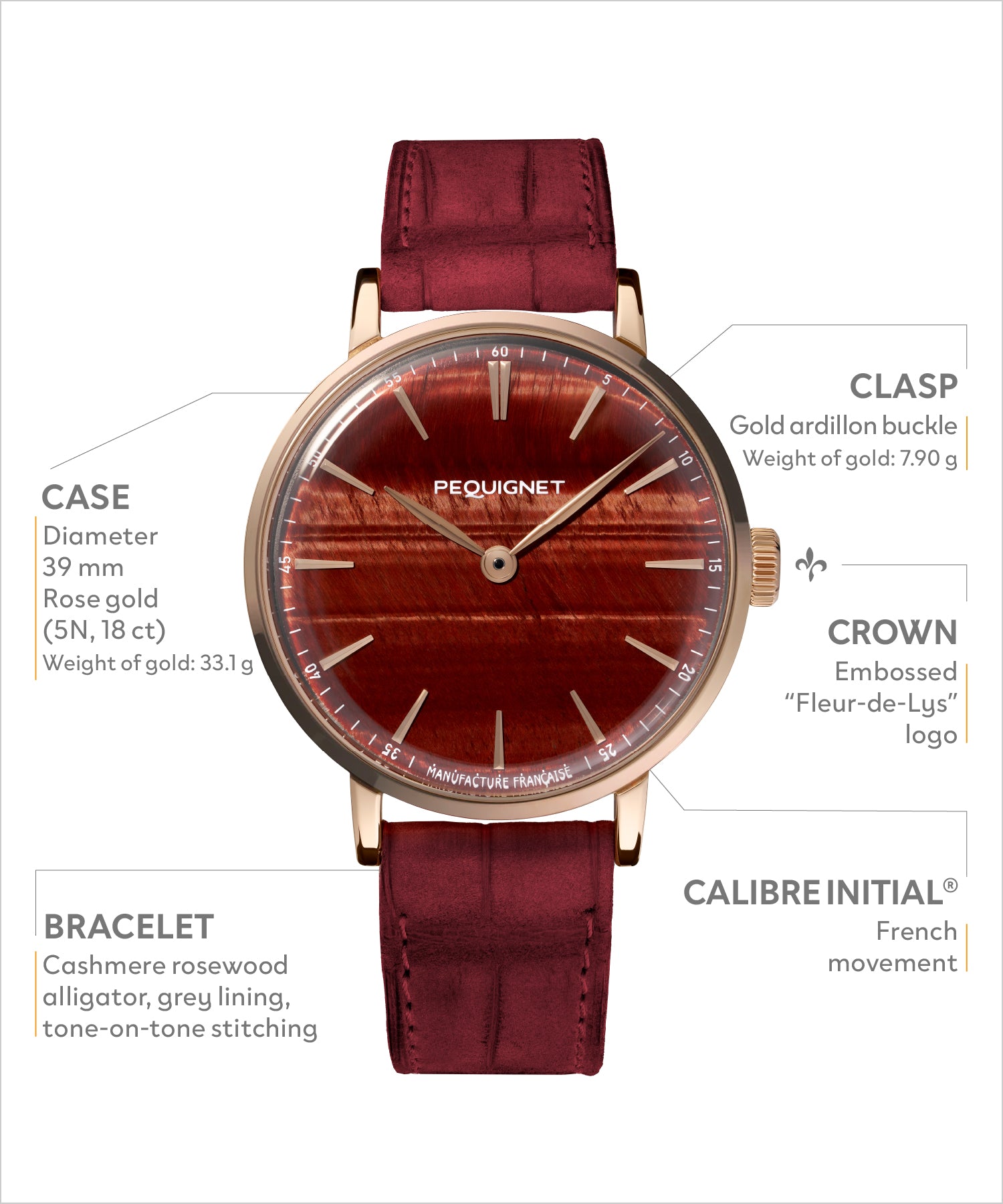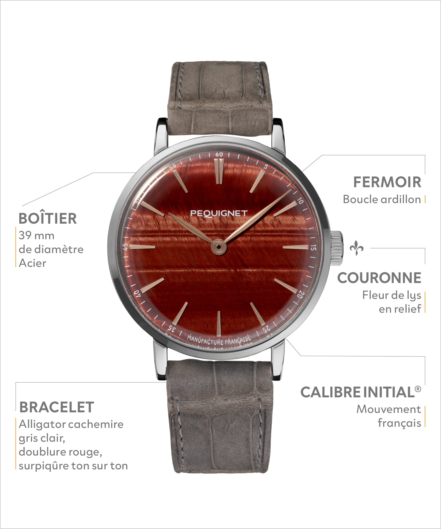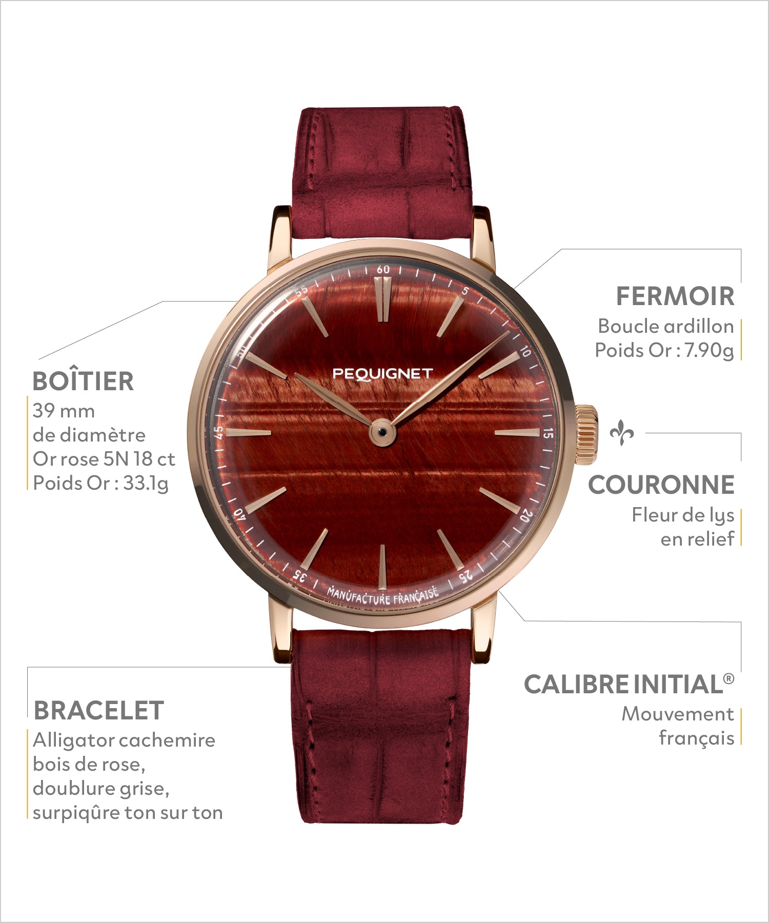 It is powered by the Calibre Initial®, the third Manufacture movement designed by Pequignet. All components are sourced within an 80km radius of the Manufacture’s, and 72% are French.
