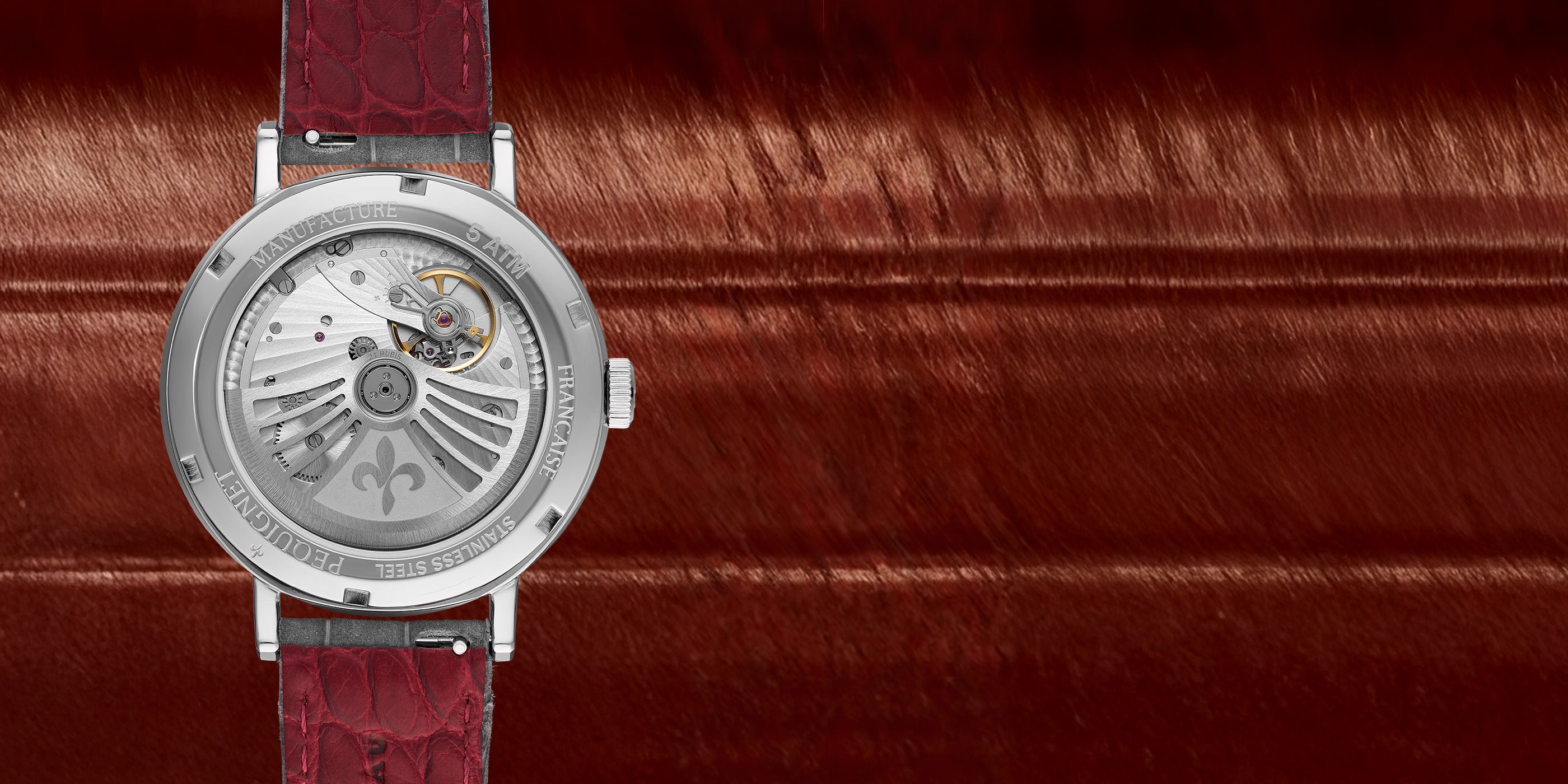 The rose-gold case version comes with a rosewood-colored burgundy strap, while the stainless-steel version features a light grey strap. The refined linings are adorned with round-scaled alligator leather.